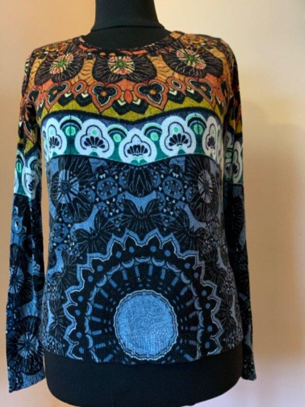 Шикарна річ дорогого іспанського бренду прислана звідтіля ж, розмір Л вказано. Ззаду шифонова вставка.Довжина - 60см, плечі - 40см, рукав від плеча- 65см, пог- 54см, пот-56см,поб- 60см. В наявності є штани стрейчеві 40 ( Л ) розміру в моїх оголошеннях, ціна 950гр , то можна костюмом придбати.