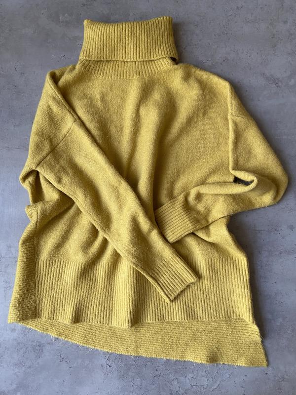 Светр reserved Колір: жовтий (гірчичний) Розмір: S (підійде на М) Склад: 2% поліестер, 6% еластан, 69% акріл В грудях: 61 см Довжина по спині: 64см Довжина попереду: 56 см Рукав (спущене плече) : 50 см від шва Асиметричний край по низу