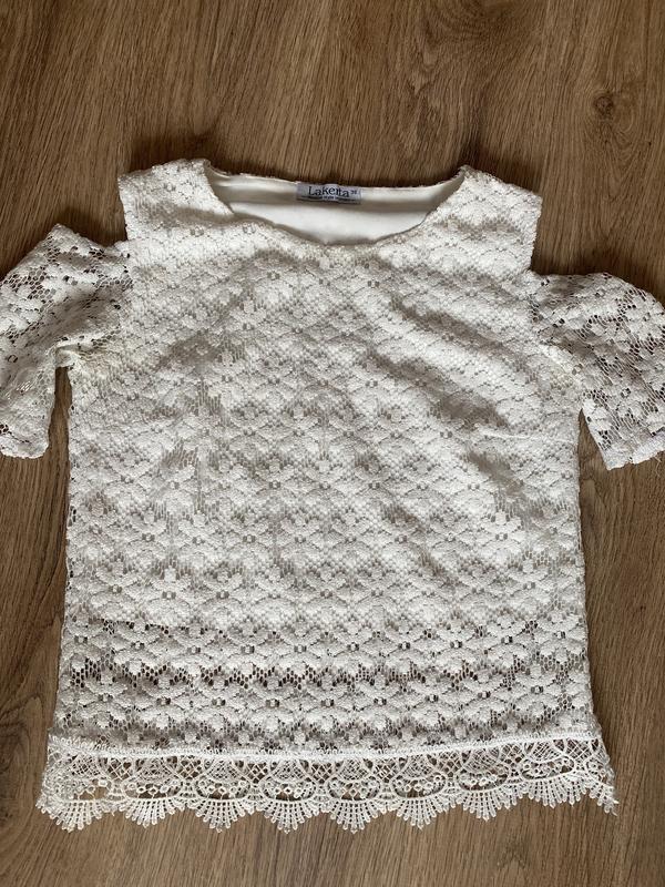 Біла гепюрова кофта Довжина 55 см Довжина нижньої підкладки 40 см Довжина рукава 15 см Напівоб’єм у грудях 45 см