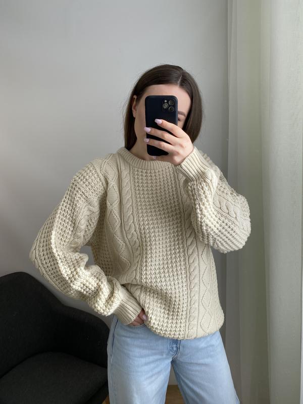 об‘ємний затишний светр Неймовірної в‘язки,подовженого фасону з високою ,закритою горловинкою як новенький ,розмір Л заміри : пог 47см рукав 64см довж 74см