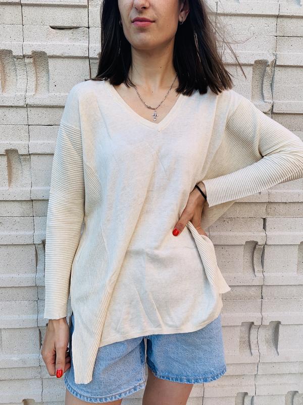 Свитер оверсайз, на бирке указан М, приятная на ощупь, мягкая, по бокам разрезы, с блестящей нитью( где-не-де). Вещь новая, с биркой. Рост модели 170