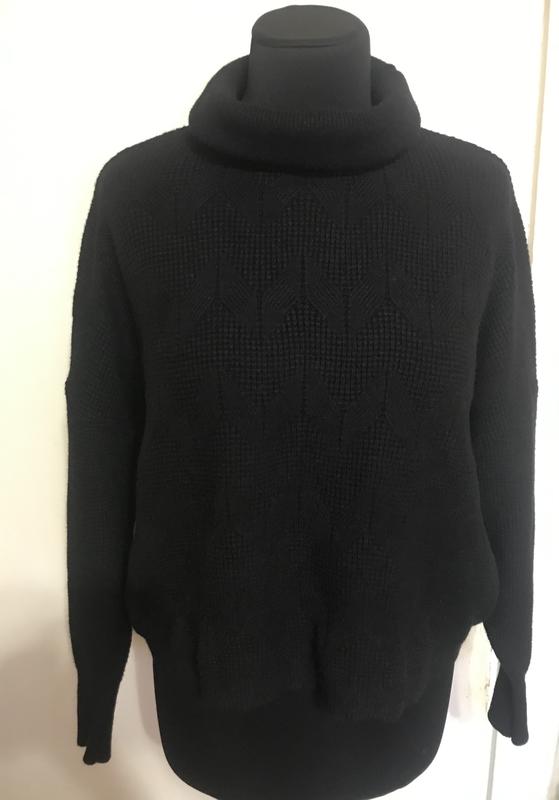 Світер свобідного крою , Італія, дуже приємний до тіла . Зпереді принц коси, на фото, колір насичено чорний, камера погано передає колір . Розмір с м. Оверсайс / довжина 55 см.