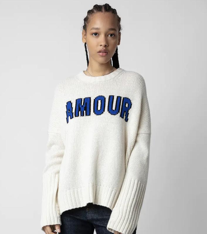 Жіночий светр з кольору екрю Light Sugar - Круглий комір - Напис «Amour» жакардовою інтарсією та підпис ZV на пуантах - Довгі рукави, отвори для великих пальців і ребристі краї Ця річ підходить за розміром, рекомендуємо брати свій звичайний розмір.