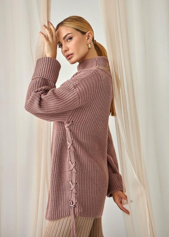 Колір: суха троянда Розміри: 42-46, 48-52 Вільний светр-туніка у ніжній пряжі з включенням волокон вовни та мохеру. Подовжений светр прямого силуету виконаний у пластичному переплетенні, що комфортно огортає фігуру. Виріз горловини декорує високий комір-хомут, що м'яко драпірується. Лаконічність образу доповнює вертикальне, регульоване по висоті драпірування. Довжина близько 79-81 см (+- 2 см). Ширина під проймою в спокійному нерозтягнутому стані 55-58 см. В розтягнутому стані 63-66 см. Ширина у талії та по низу виробу в спокійному нерозтягнутому стані 54-57 см. В розтягнутому стані 62-65 см. Довжина рукава 60-58 см. Ширина плеча 17-19 см. Висота коміру 10 см. Висота манжети 12 см. Склад: - 70% - АКРИЛ - 20% - МОХЕР - 10% - ВОВНА