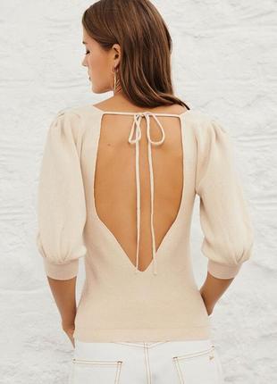 в'язаний топ від люксового бренду BA&SH розмір 0 - йде на XS-S Светр із глибоким вирізом на спині Квадратний виріз горловини спереду Пишні рукави до ліктя Зав'язки на спині 80% бавовна, 20% вовна