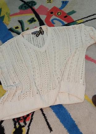 м'який і приємний на дотик. ширина по плечах 70, довжина 56, довжина рукава 45. є невелика дірочка на рукаві, не дуже помітна
