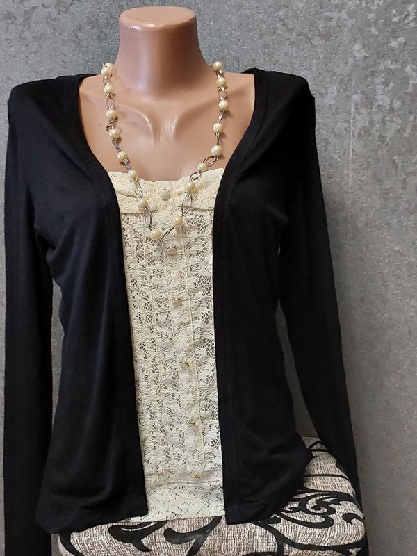 майка болеро кардиган нове, стік, ажурна майка-обманка спереду молочного кольору, верх короткий віскозний кардиган, кофта. довжина по спинці 60 см, НОГ 40 см, довжина рукава від плеча 63 см, ширина плечей 39 см. склад піджака віскоза, майка поліестер розмір вказаний 12