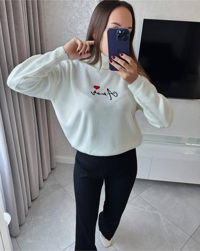амурСветр Модель:1043-32 Тканина дрібна машинна в'язка Склад: 20% вовна, 20% поліамід, 60% акрил Светр з високим коміром , спущене плече, вільного крою . Надпис вишитий Полуобʼєм грудей 62 см Колір білий ОГ-62 см Довжина -55 см Довжина рукава від горловини-68 см
