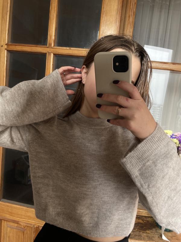 Короткий светр з м'якого трикотажу з додаванням вовни. Круглий виріз, широкі рукави. Ребра по горловині, рукавам і подолу. Рівний низ. Розмір S підійде і на M