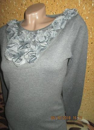 тепла добре тягнеться,колір сірий-середній якісна,завжди потрібна в холодну пору року! прикраса у вигляді троянд. розмір написаний L-XL,але можна і менше не розтягувати або добре тягнеться-пружинить мірки довжина-80см довжина пліч шву-64см довжина рукава 64см напівобхват пройми-21-24см пог-42см тягнеться до 55см піт-38см тягнеться 58см. Склад: кашемір-40% віскоза-35% район-15%