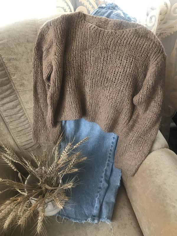Актуальний вільний вкорочений светр. Виглядає сучасно, гарно поєднується з джинсами на високій талії, можно поєднувати з топом, майкою. М’який приємний матеріал. Пог 55 см.