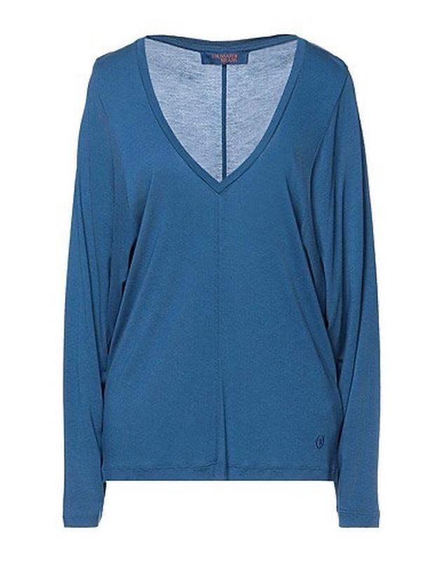 Синя кофта з широккими рукавами вiд TRUSSARDI JEANS вільний фасон, може бути на розмір S/М легка приємна тканина єфектний V-подібний виріз Розмір: XS (42) - довжина по спині - 65 см, ПОГ - 45 см , довжина рукава - 66 см Склад: 100% віскоза