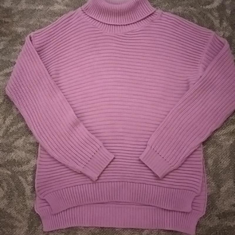 Гарний колір, дрібна в'язка, модний дизайн, спереду коротший, ніж ззаду, з бічними розрізами, теплий.