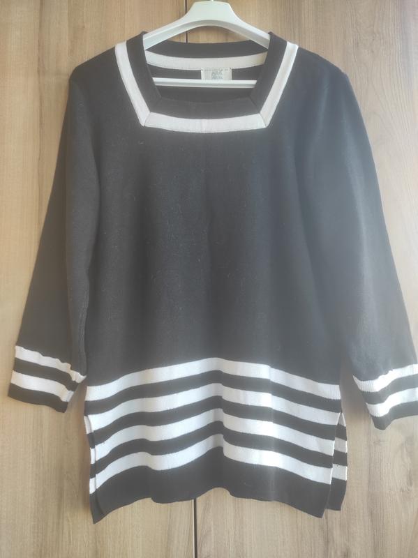 Кофта, светер чорного кольору з білими смужками, розмір 48-50 наш. Довжина 68, довжина рукава 50, плечі 39-46, ПОГ 50-70, добре тягнеться, ПІТ 49-69, низ 50-70 см. Стан ідеальний!