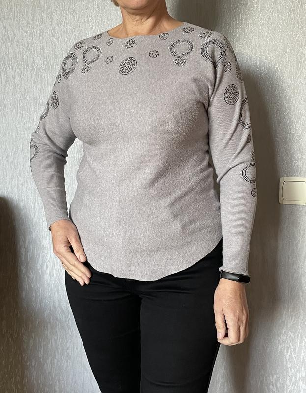 Кофта с принтом блестки на рукавах и груди. Хорошо сядет на размер L. Удобная и праздничная. Состояние красивое. Торг возможен.