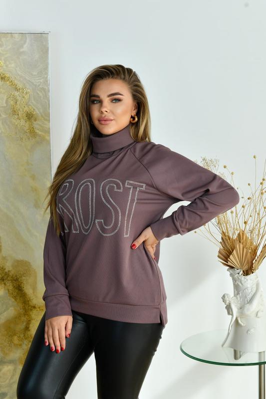 Светр ▪️Тканина: трикотаж-рубчик з начосом Вовна 75% Віскоза 15% Еластан 10% Кольори: чорний, графіт, мокко, мінт, слива ▪️Розміри: 48-50, 52-54, 56-58, 60-62, 64-66 Неймовірно стильний светр із якісного трикотажу-рубчик з начосом (розтяжність середня). Светр з високим горлом, рукави-реглан на манжеті. Силует у вигляді трапеції з невеликою асиметрією по низу - попереду коротше, позаду трохи довше. Низ светра на манжеті, з боків невеликі розрізи. Декорований стильним надписом із високоякісних камінців.