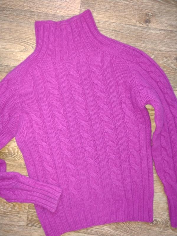 светр стан ідеальний чудова якість 💯 шерсть Шотландія гарний насичений колір,фуксія, товсте фактурне в'язання рукава реглан розмір вказаний на бирочці М (маломмірить) довжина ззаду 55 см висота ворота 10 см довжина рукава, до коміра,66,5 см пог. 46 см. Усі питання уточнюйте перед оплатой