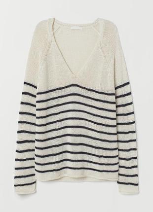 Светр H&M із довгим рукавом і V-подібним вирізом, кремовий і темно-синій у смужку. Стан ідеальний . По бірці S , але підійде і на М , сидить вільно . Заміри: довжина 66 см , ПОГ 49 см , рукав від горловини 74 см