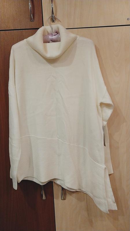 Дуже хорошої якості, м'який, светр-гольф, білого кольору, новий, асиметричного крою, український розмір 56-58, напівобхват у грудях 60см, ціна на ціннику 99$.