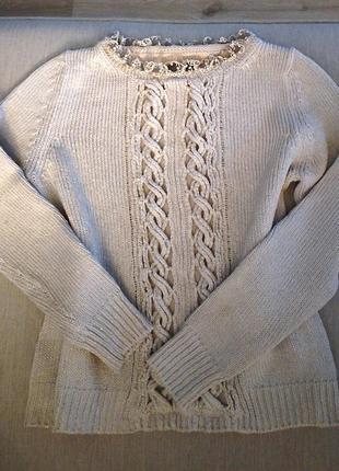 Женский нежный свитер украшен объемной вязкой спереди. По спинке вязка простая, ровная. Рукава, горловина, низ - резинка. По горловине имеется тонкая полоска кружева в тон изделия, которая подчеркивает особый стиль. Цвет - бежевый. Присущая серебряная нить, это добавляет легкого сияния (серебряный не блестящий, а приглушенный), которое даже не сразу заметно. Силуэт прямой. Размер М. Замеры: длина изделия - 57 см, полуобхват груди - 47 см, длина рукава 60 см. Стан - отличный, можно сказать идеален. 100% cotton