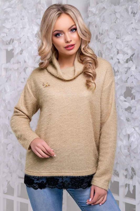 Интернет-магазин ST-SEVENTEEN предлагает очаровательным покупательницам новую уникальную коллекцию женской одежды Аngora elite. Она отличается необычайной комфортностью и уютом, поэтому сделает осенне-зимний период 2018-2019 теплым, легким и приятным. Кофта-свитер недорого от производителя отличается отменным качеством и стильным женственным оформлением. Она изготовлена из очень теплой и приятной на ощупь ангоры и имеет объемный воротник-хомут, который уберегает шею от ветра и холода. Помимо этого, горловина выглядит неординарно и успешно дополняет модный образ. Низ кофты свитера в черном цвете задекорирован красивым ажурным кружевом. Модель свободного фасона отлично подойдет для праздничного, повседневного, городского или современного спортивно-молодежного образа.