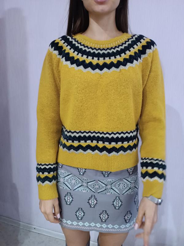гарний, дуже теплий светр яскраво жовтого кольору.З цікавим принтом