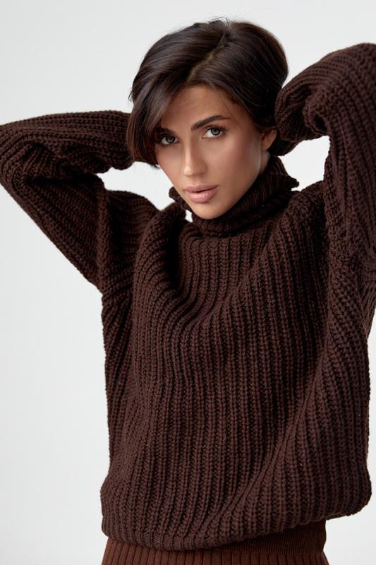 Модель повністю виконана з фактурної машинної в'язки у техніці "резинка". Прямий низ і рукави закінчуються в'язкою у вигляді манжет, а кругла горловина доповнена високим коміром, що складається вдвоє. Колір: коричневий, молочний, темно-коричневий Матеріал: В'язка Склад тканини: 70% акрил, 30% поліестер Розмір універсальний:42-50 Довжина виробу :56см Довжина рукава від горловини:72см Об'єм грудей :100-110см арт4635
