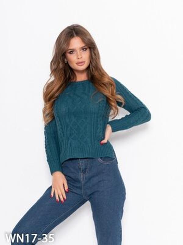 Вязаный шерстяной зеленый свитер прямого кроя с боковыми разрезами. Модель с длинными рукавами-реглан и полукруглой закрытой проймой горловины. Рукав: 47 Длина: 55 50% хлопок, 30% шерсть, 20% полиэстер
