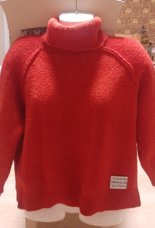 Свитер, очень теплый, приятный к телу, не колеблется, цвет насыщен красный, состояние идеальный, машинная вязка, замеры на фото