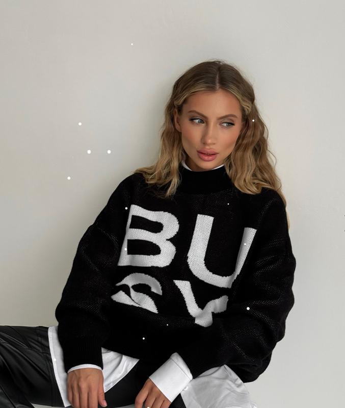 Светр з в'язаного трикотажу. Спущена лінія плеча та вільний крій поєднують в собі стиль та комфорт. Акцентною деталлю є великий принт спереду у вигляді слова BUSY. Виріб можна стилізувати як з офісними так і з повсякденними образами.