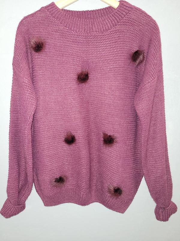 Стильний светр фіолетового кольору , з доповненням пумпонів з норки, але за бажанням вони знімаються. Стан хороший, розмір М-Л Заміри по запиту