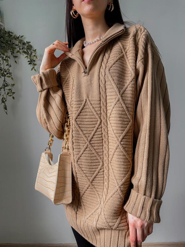 Просто неймовірний 🧸 Якість люксова 👌 Светр оверсайз фасону у бежевому кольорі ✨ З коміром на металевому замочку Дуже якісний, має щільну та важку в’язку, у складі: 50% вовна, 50% акрил Покрій вільний та подовжений, для любителів оверсайз фасону) має довгі рукава, які красиво можна підкотити🙌 лінія плечей занижена Розмір по бірці М, завдяки фасону можна на більший Півобхват грудей: 62 Довжина рукава від горловини: 82 Довжина: 74 Стан нового без ковтунців та слідів носки Вдягнуто на фото розмір: XS