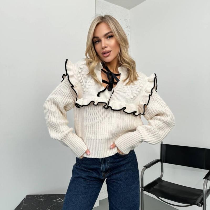 Светр з ажурним плетінням для витончених образів з брюками та спідницями. Ніжний трикотаж створює потрібний об'єм та легкість.