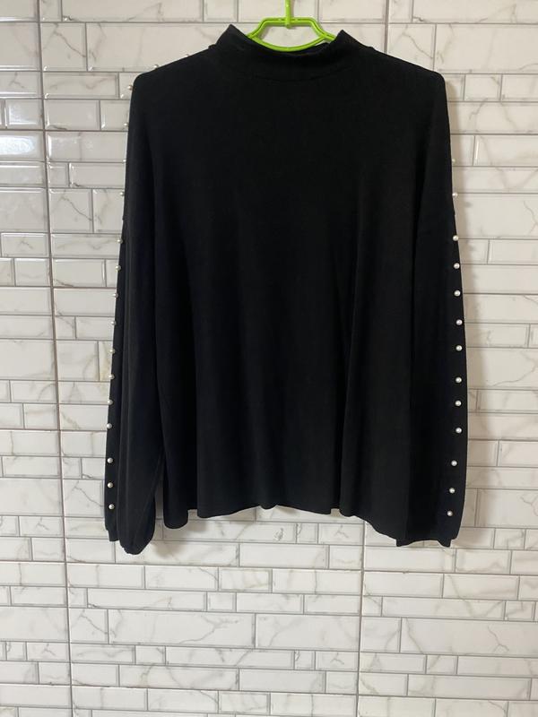 Чудова чорна з перлинами на рукавах кофта-светр Склад та розмір є на фото Тканина дуже приємна до тіла,легко тянеться Стан ідеальний Довжина 69 Рукав від горловини 77,на манжеті ,плечі спущені Біцепс 24+,сам рукав широкий Пог 62/73 Понизу 64/74