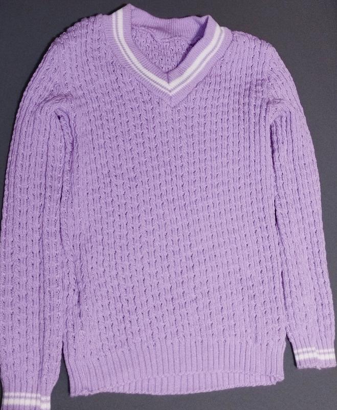 Жіночий в'язаний светр зі стильною горловиною Розмір 42-48 довжина 60 см ОГ - 45 см (розтягується до 50 розміру), Рукав - 62 см, Склад: 30% вовна, 70% акрил, Колір: бузок