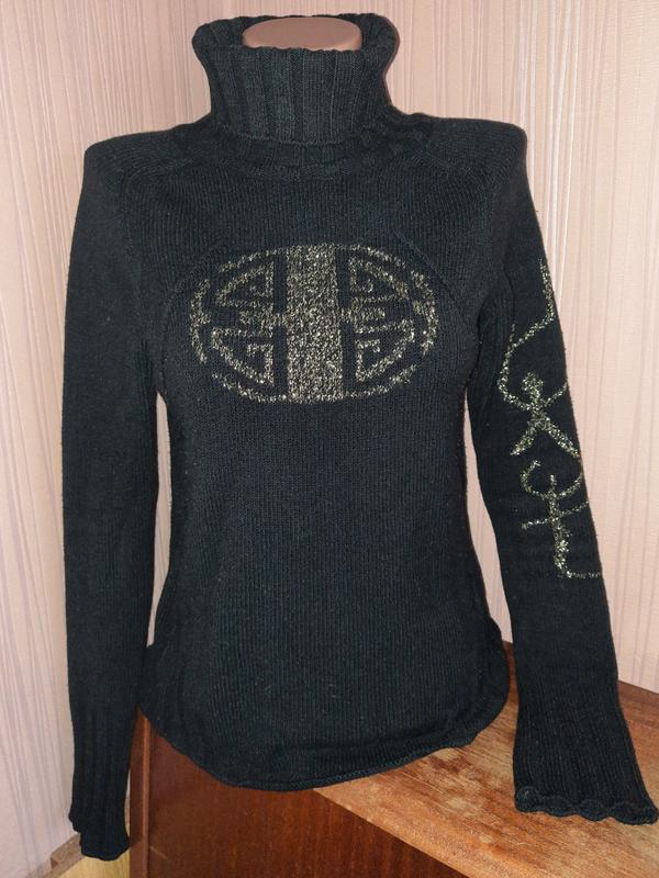 Светр теплий чорний, малюнок на грудях та лівому рукаві- ввязана золотиста нитка. Зміст нитки-котон, акріл, поліамід. Спина чорного кольору одноманітна. Розмір-40-46 . Заміри: ширина-44(тягнеться до 48), довжина-56см, довжина рукава від коміра (рукав-реглан) - 72см, комір-висота 18см. Стан речі-був/використанні, але виглядає доволі добре (ні секонд!). Пересилаю після оплати на картку. Повернення товару немає.