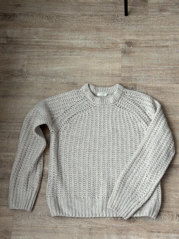 Стильний, приємний на дотик. Розмір S, рукав приспущений 75 см від горловини, ширина 50 см, довжина 58 см. У складі 14% вовни.