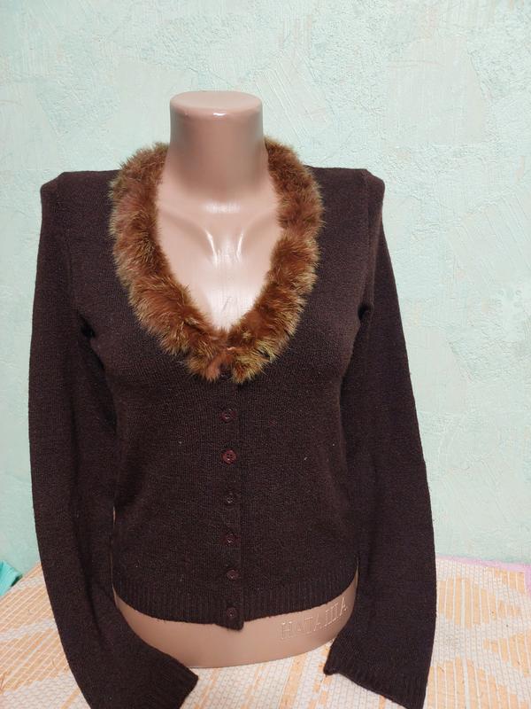светр кофта джемпер із хутряним коміром кролика, в ідеальному стані, довжина по спинці 51 см, пог 40 см, довжина рукава від плеча 58 см, ширина плечей 35 см. склад 91 акрил, 8.2 поліамід, 0.8 лайкра. розмір 10 виробництво Франція