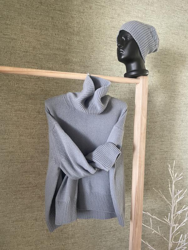 Ручна робота, колір- світлий джинс, кашемір з мериносом. Довжина 55,ширина- 60,рукав 77. Шапка продається окремо- 1100 грн. Ширина 23, довжина 28.