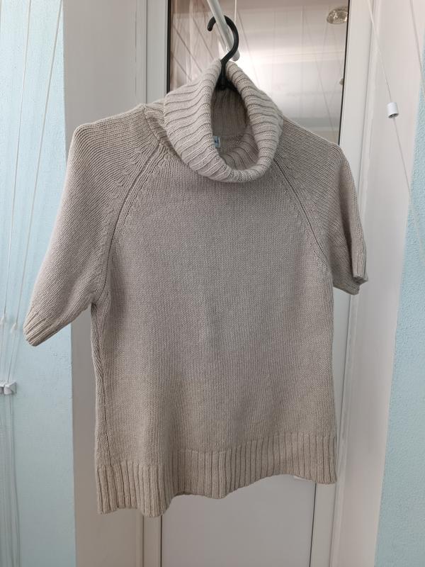 Светрик з коротким рукавом приємного сірого кольору у відмінному стані. Чудовий склад: 30%-віскоза; 28%- вовна; 20%- поліамід; 10%-ангора; 10%- шовк; 5%- кашемір. Розмір-38-40/ 10-12. Довжина-54,5; рукав від вороту-34; ПОГ-43; ПОТ-40; ворот18×19.