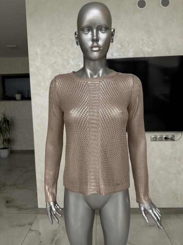 Очень красивый свитер с напылением. Блестящий принт медного цвета. Поперек свитера спереди и сзади – узор, имитирующий резинку. Фирменная деталь серебристого цвета сбоку. О-образный вырез и рукава отделаны резинкой. Размер xs, состояние идеальное как новый. Замеры: длина 59см, пог 45см, рукав от шва 63см, плечи 35см, ширина по низу 46см, ткань тянется.