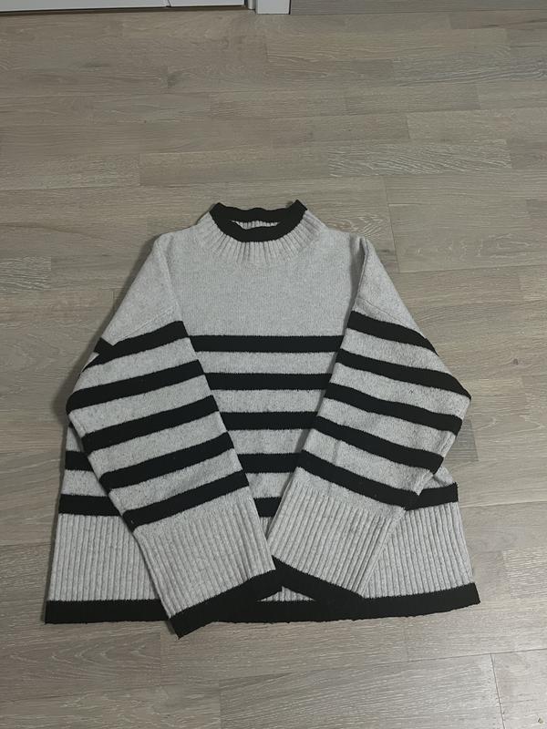 трендова кофтинка у смужку Розмір L Стан хороший Дефектів немає Але може підійти як на S та XL (оверсайз) З недоліків тільки те, що на кофті через деякий час носіння зʼявляються катишки Але їх з легкістю можна прибрати За додатковими питаннями чи замірами пишіть у дірект)