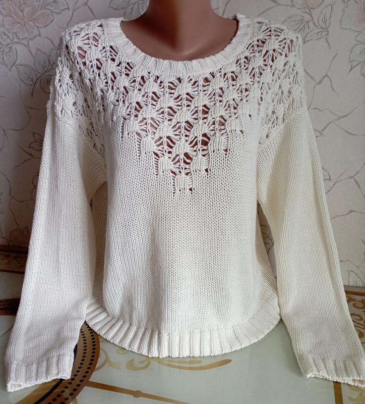 Фірмовий , стильний светр оверсайз з ажурною в'язкою , плечі спущені -вільно , ПІГ 55 , ПІТ 54 , рукав від горловини 72 , довжина виробу 50 .