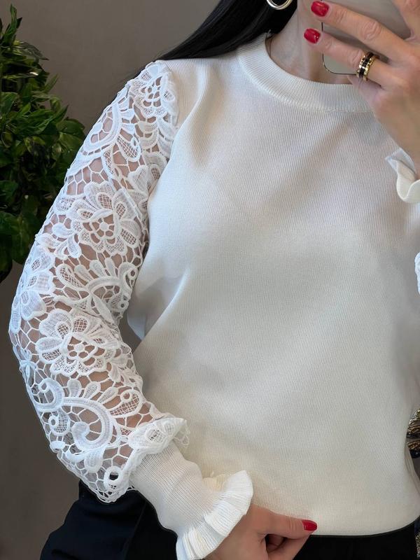 яскрава, стильна і комфортна кофта вільного крою з круглим коміром, на гумці внизу і високих манжетах, шикарними рукавами з приголомшливо гарного мережива на підкладці з прозорої сітки, виготовлена з приємного до тіла трикотажу дрібної машинної в'язки кофточка має чудовий вигляд на дівчатах з різними типами фігури, в ній затишно і легко, вона створить чудовий настрій і займе гідне місце у вашому гардеробі розмір єдиний 42-46 довжина 56-58 см н г 49-50 см, довжина рукава від шиї 68-70 см код 016