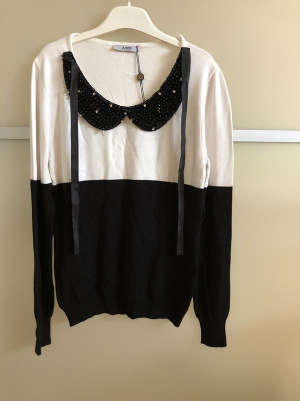 Светр AMN чорно-білого кольору з красивим коміром оздоблений паєтками, бісером і камінням. Якість-супер! М'який і приємний матеріал. Светр виглядає дуже дорого і гарно! Розмір L, зроблю заміри за запитом. УВАГА: на комірі не вистачає одного камінчика! ЦІНА ЗНИЖЕНА! Светр новий, з етикеткою. Заміри Плечі 37 Довжина 57 Рукав 60 Груди 82(тягнеться) Талія 70 (тягнеться)