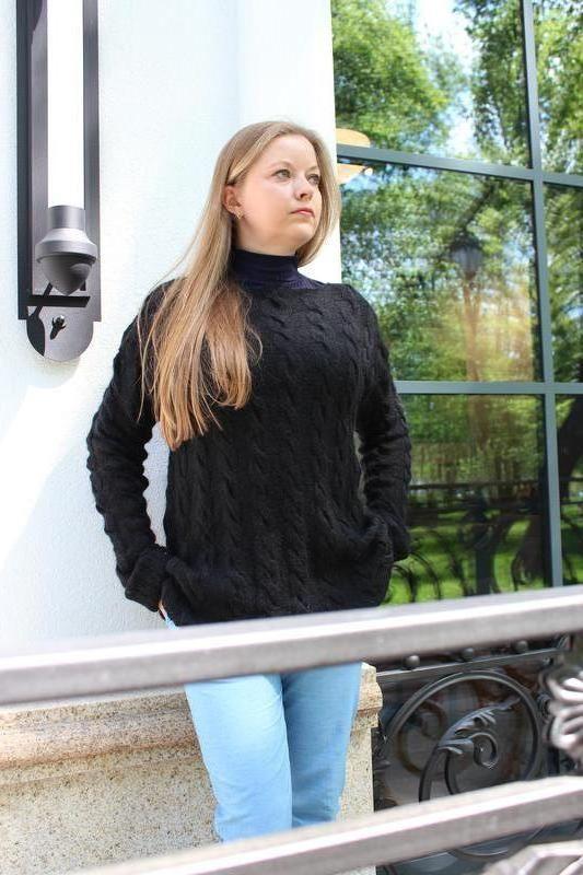 Светр-павутинка чорного кольору з кидмохера. Жіночий джемпер Дуже легкий і теплий светр на весну-літо. Вага не більше 300г Розміри: Довжина 72см Ширина 51см Довжина рукава 60см Ширина рукава внизу) 22 см Можливе виготовлення іншого розміри і кольори. Термін виготовлення 3 тижні. Додаткові характеристики: Колір: Чорний