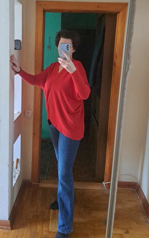 Светр насиченного червоного кольору, рукав летюча миш, приємна на дотик тканина( бірок нема, схоже на кашемір), перед скорочений, спинка довша.Ідеальний стан.