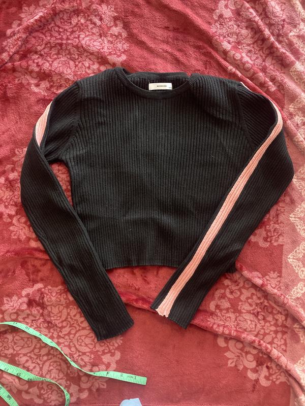 Черный в рубчик , с розовыми вставками на рукавах , тянется Размер S , подойдет как и на XS так и на М Состояние хорошее Reserved Длина 40 По плечи 34 По грудь 38 Рукав 56