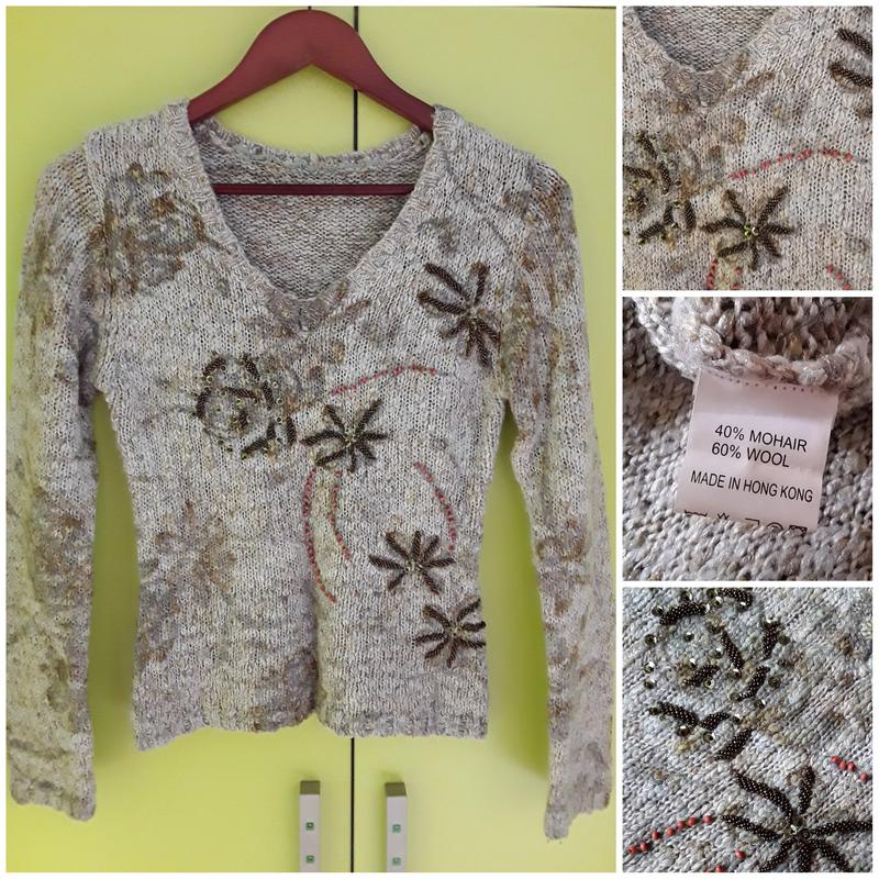 Дуже гарний теплий светр з чудовим складом (40%мохер, 60%вовна). Спереду легенька вишивка бісером та намистинками. Колір сіро-оливковий. Підійде на S-ку або невелику M-ку. Стан нового.