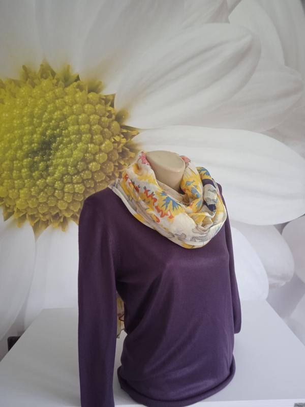 Класична однотонна кофтинка з довгим рукавом насичено фіолетового кольору. Легка та комфортна. Приємна на дотик. Гладка машинна в'язка. Нитка середньої товщини. Стрейч. Лягає по фігурі. Акуратний виріз. Гарно виглядає з шарфом в тон у комплекті (шарф може бути замінений, але в кольорі). Є розміри.